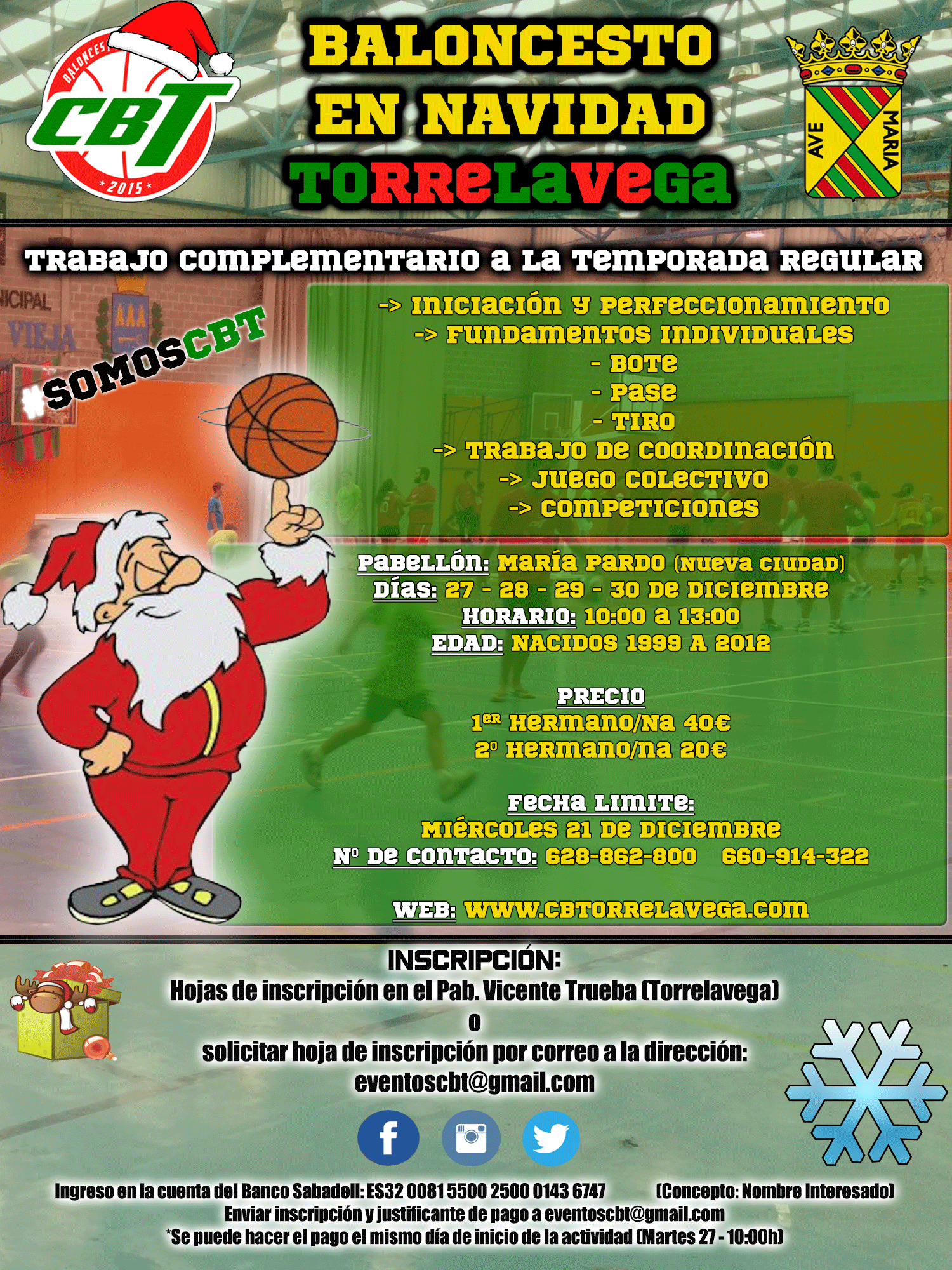 Los días 27, 28, 29 y 30 de Diciembre, el CBT Torrelavega organizará unas jornadas de tecnificación, para todos aquellos que quieran inscribirse. Se desarrollará por las mañanas desde las 10:00 hasta la 13:00.