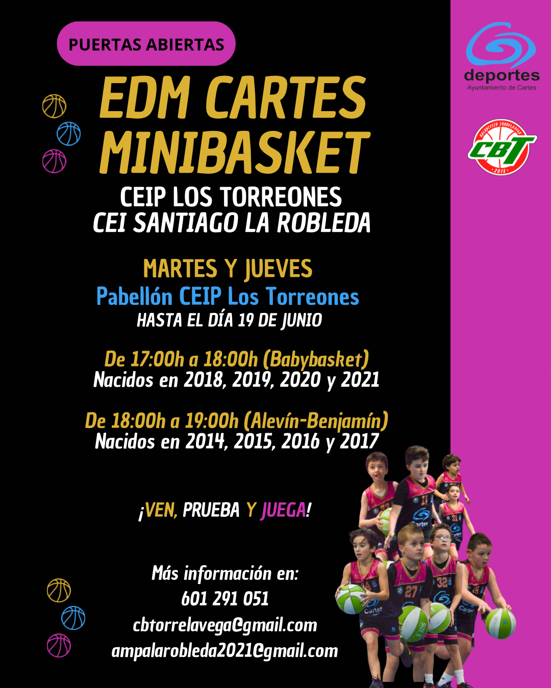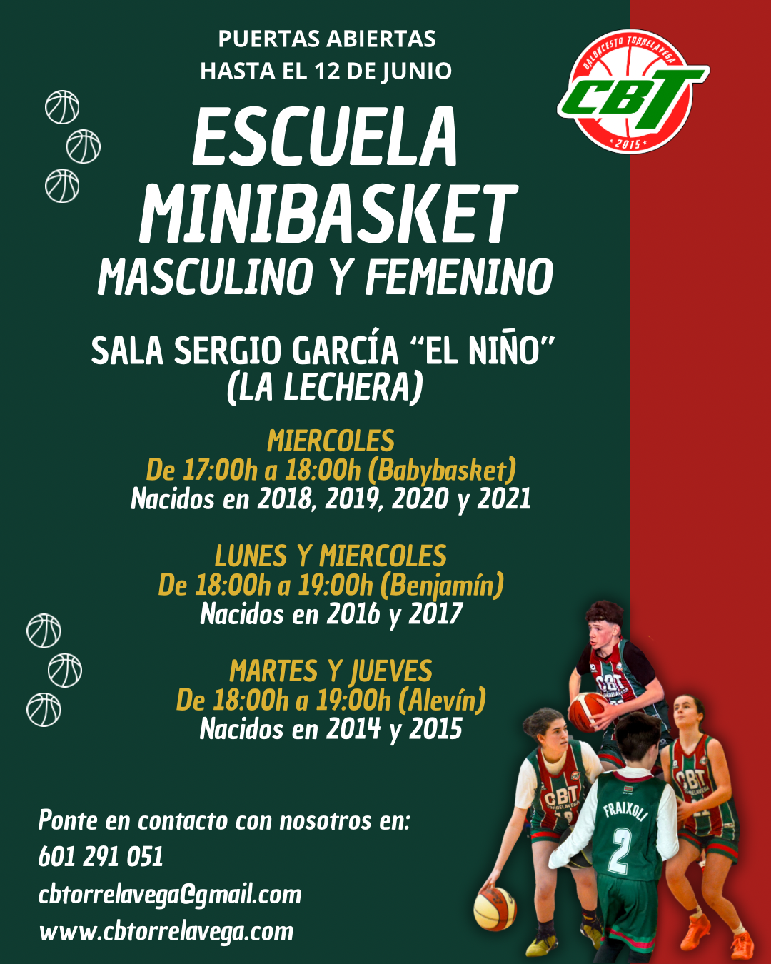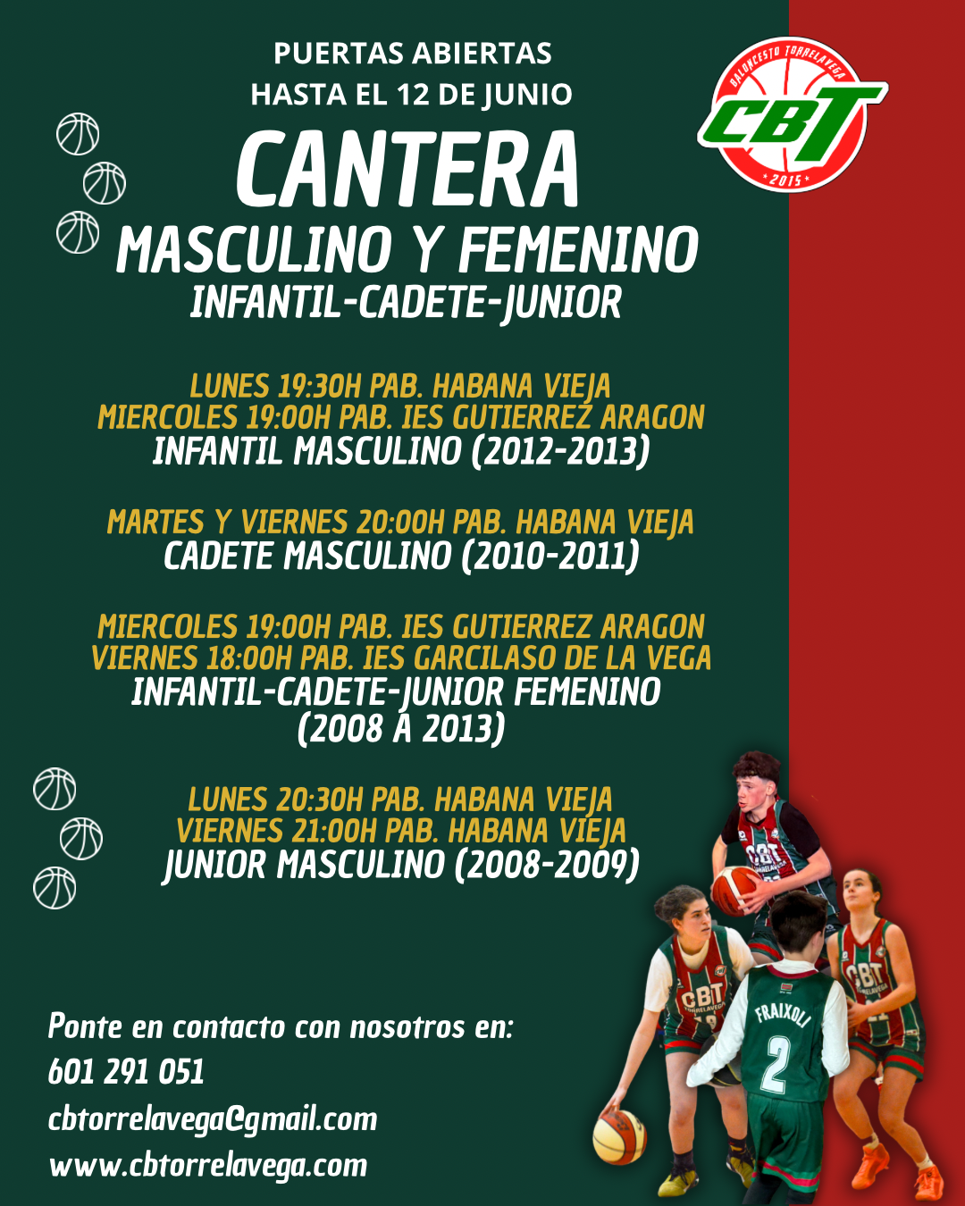 Consulta cualquier duda en el correo electrónico: cbtorrelavega@gmail.com o en el teléfono/Whatsapp del club: 601291051.